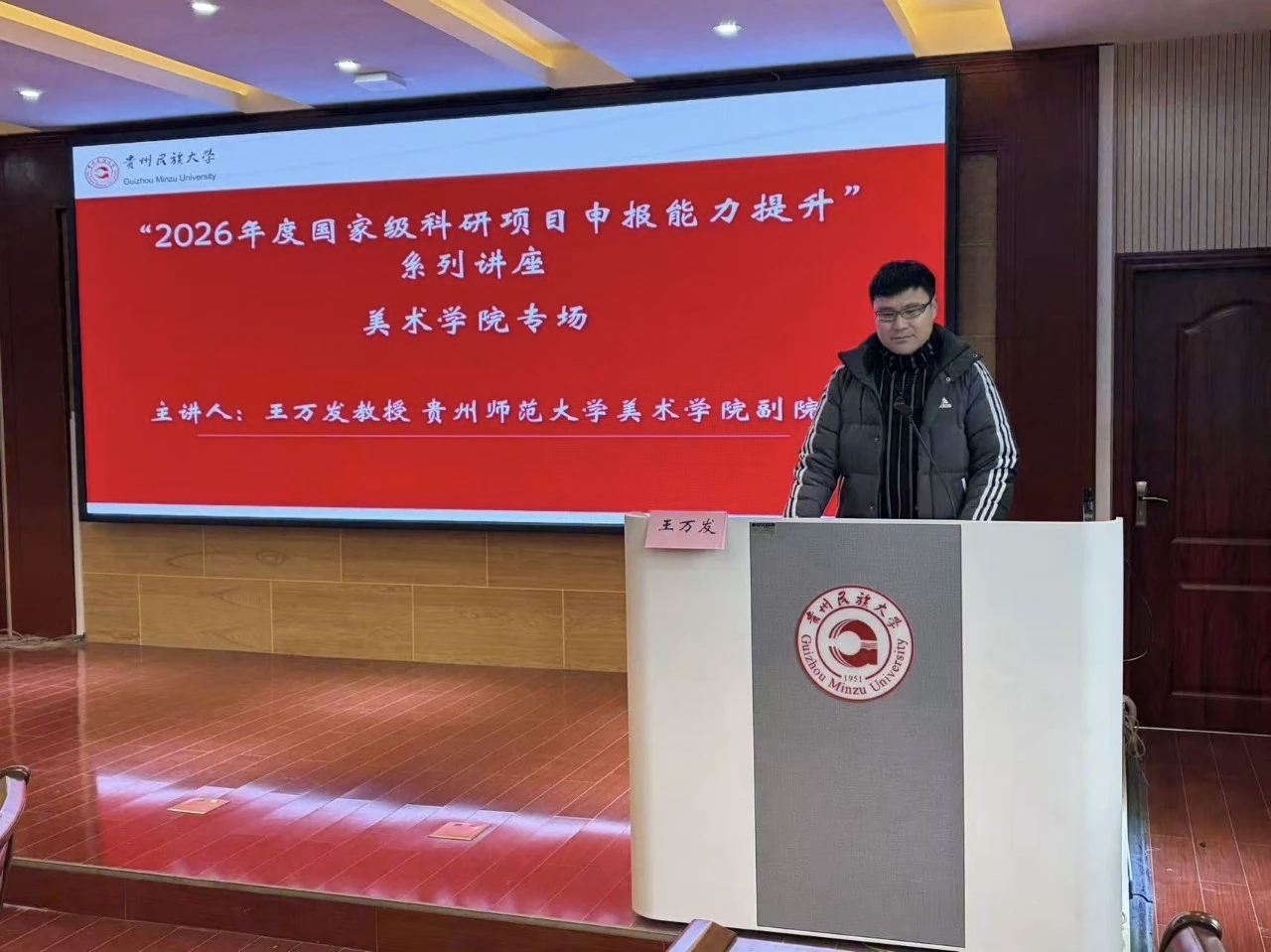 为助力科研项目申报,夯实学术研究基础,贵州民族大学美术学院举办2026年度国家级科研项目申报能力提升系列讲座(美术学院专场)。学院邀请贵州师范大学美术学院副院长王万发教授开展人文社会科学类项目申报经验分享讲座,为现场师生提供了富有见地的学术指导。讲座中,王万发教授首先系统梳理了人文社科纵向项目体系,涵盖国家社会科学基金项目、教育部人文社会科学研究项目、省哲学社会科学研究课题等五大类,并详细介绍了各...