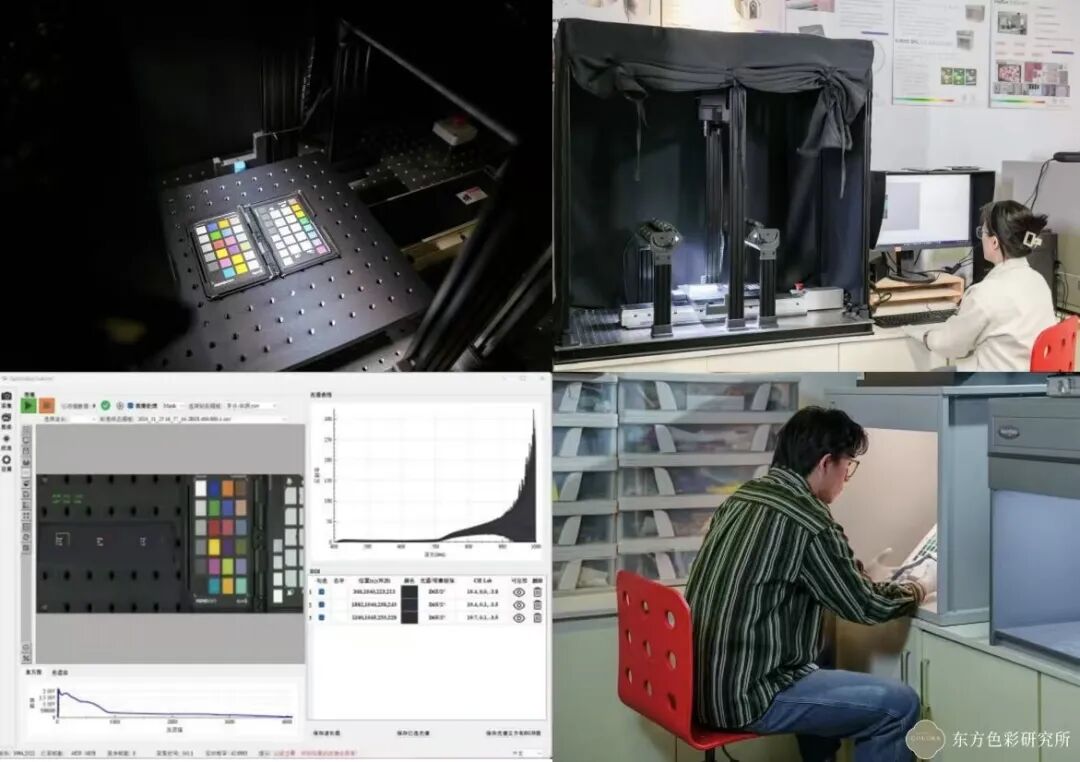 “东方传统色彩计划”的技术支持单位——清华青岛艺科院色彩实验室、清华大学艺科中心色彩研究所常务副所长宋文雯及其团队,运用国际领先的超光谱分光测色设备,对潘淘洁收藏的水族服饰和水书样品进行数据检测,将4种色彩转化为RGB、CMYK、Lab等颜色标准的数据化色值。