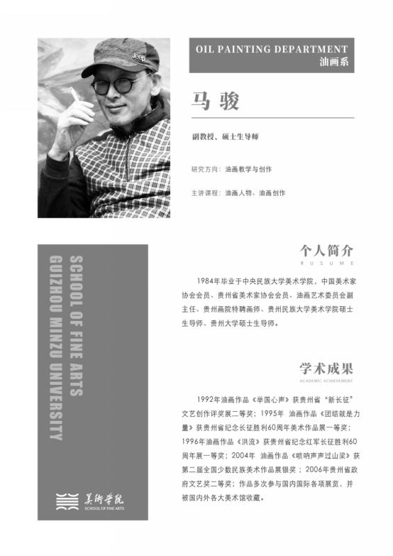 马骏 副教授,1984年毕业于中央民族大学美术学院,现为贵州民族大学美术学院基础理论教研室主任,贵州民族大学美术学院教师,中国美术家协会会员。主研方向 油画