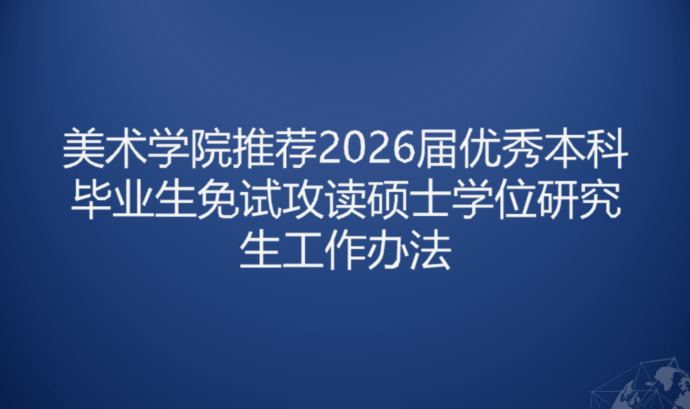 2025年09月06日美术学院推荐2026届优秀本科毕业生免试攻读硕士学位研究生工作办法根据教育部推荐优秀应届本科毕业生免试攻读硕士学位研究生工作(以下简称“推免工作”)相关文件要求及学校相关要求,为进一步规范和加强推免工作,提高推免选拔质量,确保推免工作的公平公正,特制定美术学院推荐2026届优秀本科毕业生免试攻读研究生工作办法,具体如下:一、推免遴选工作小组学院成立推免生遴选工作领导小组,负责学院推免工作的具体实施,...